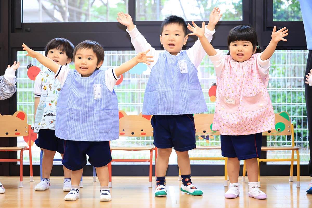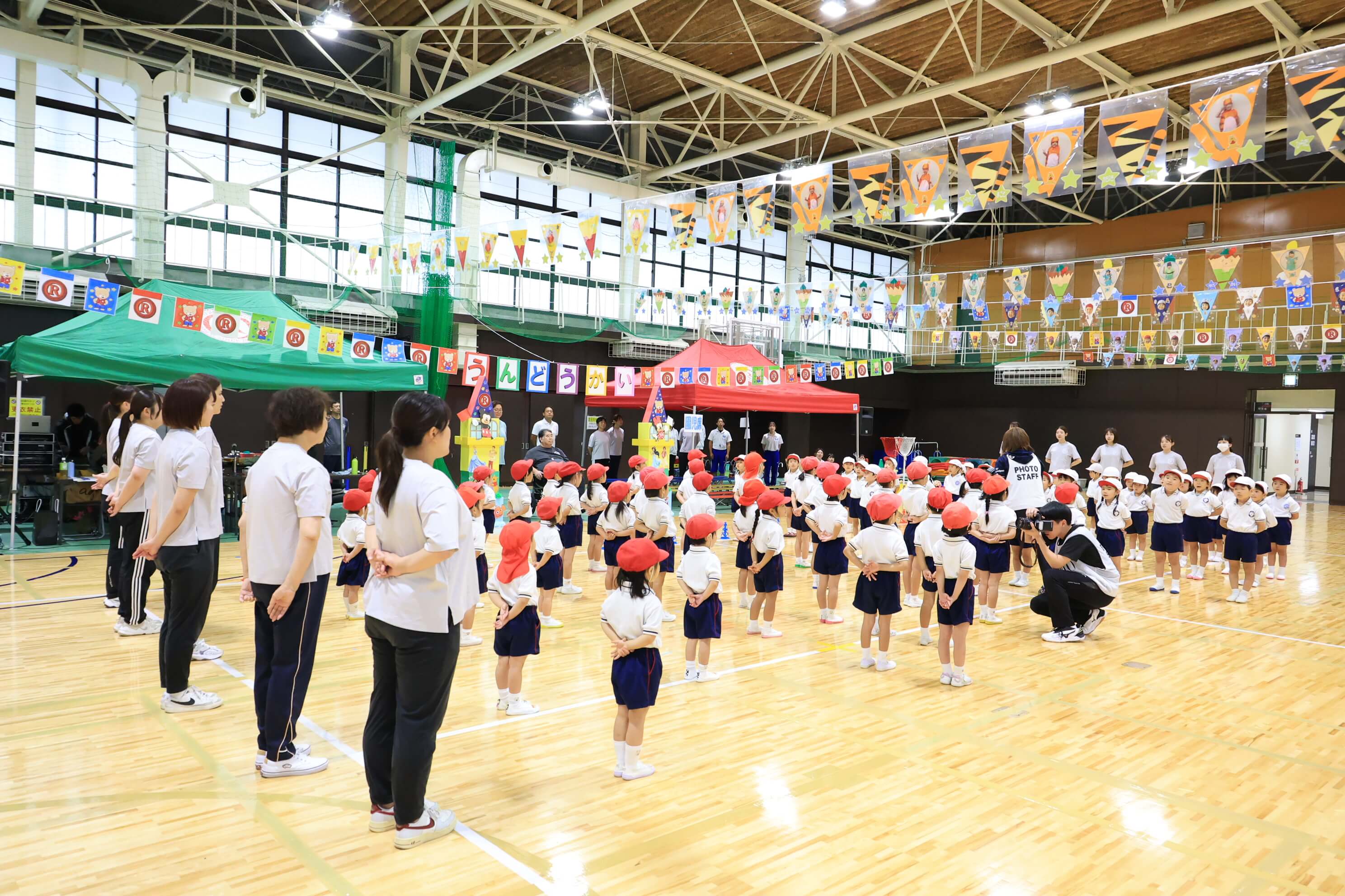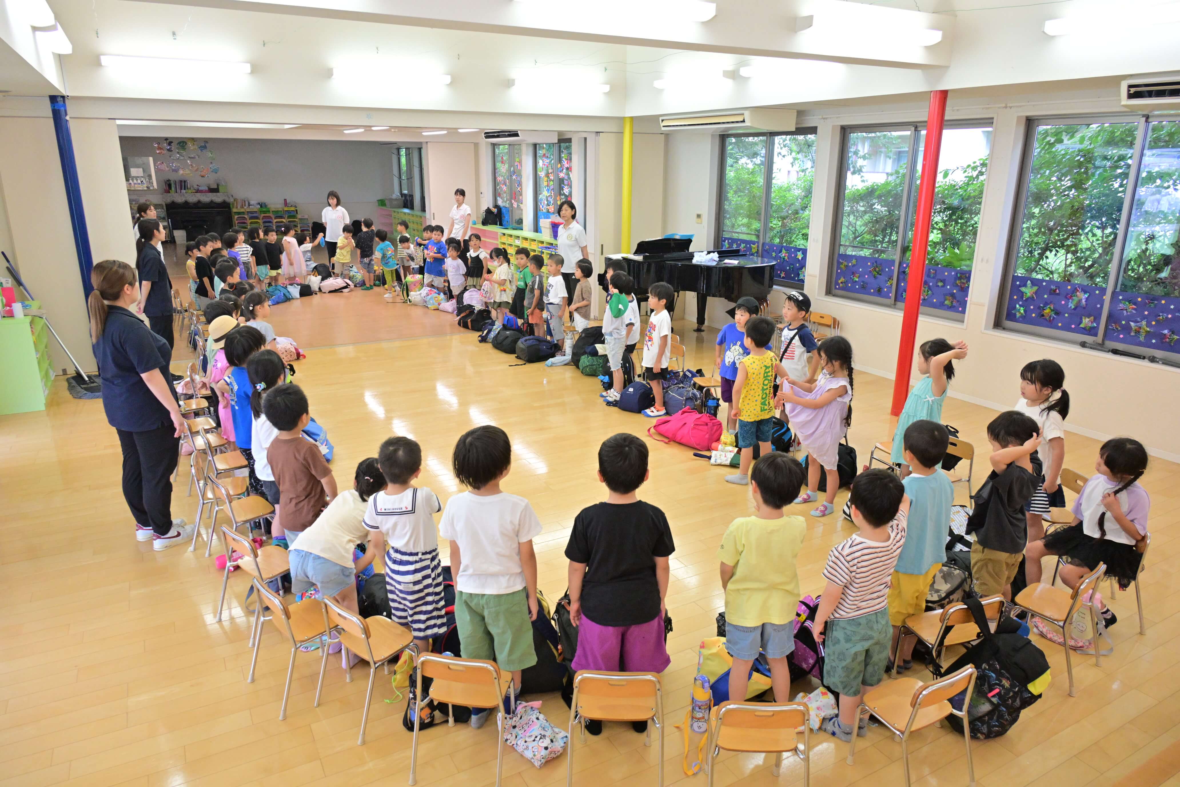 年少さん、年中さん、年長さんみんな揃って、音楽に合わせて体操します。