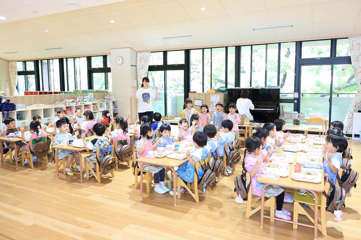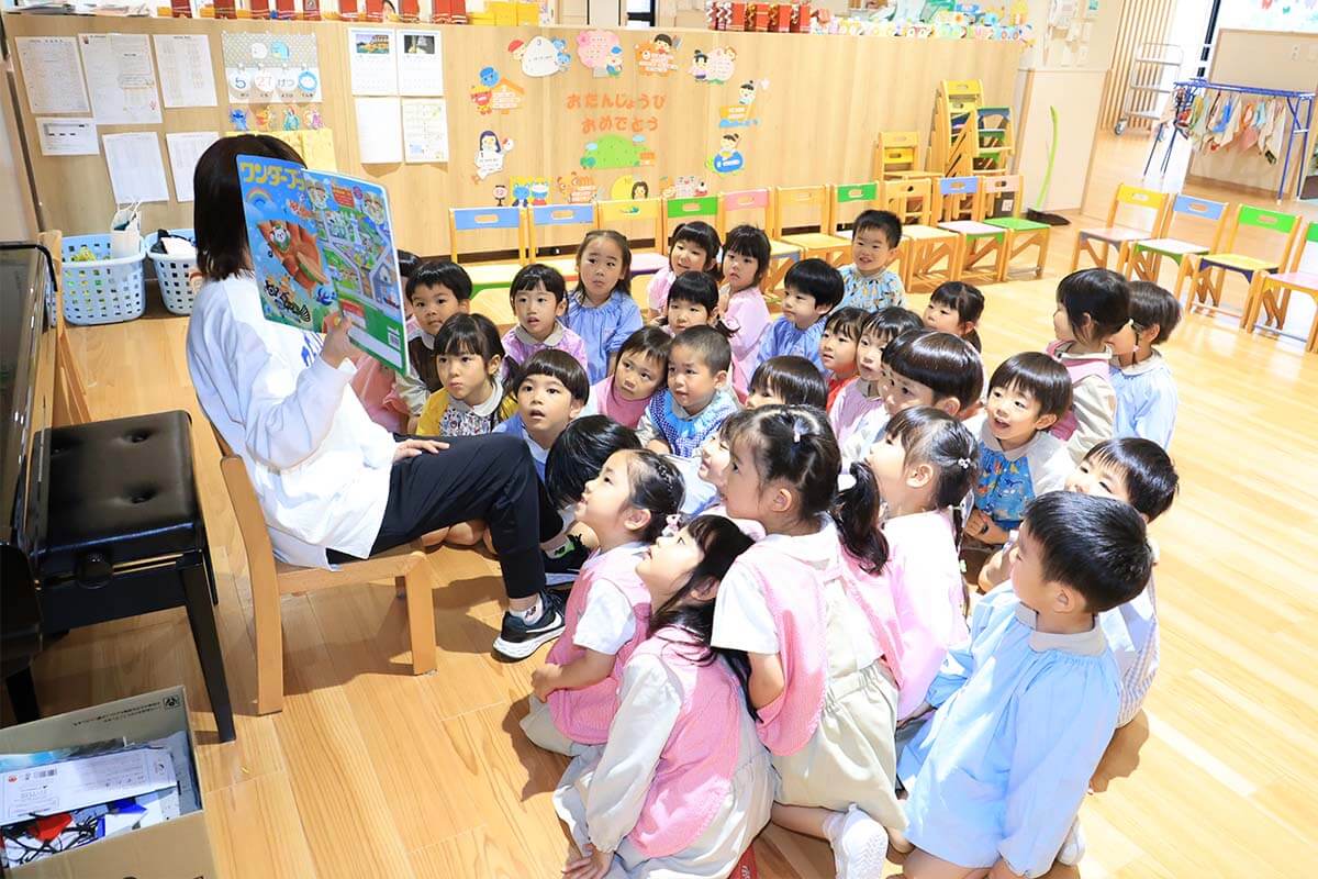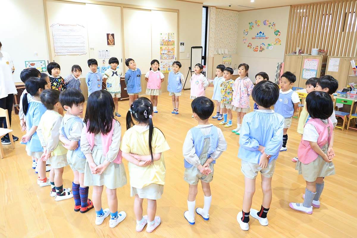 朝のごあいさつや先生のお話を聞き、季節の歌を歌ったり、リズム遊びしたりして楽しく過ごします。